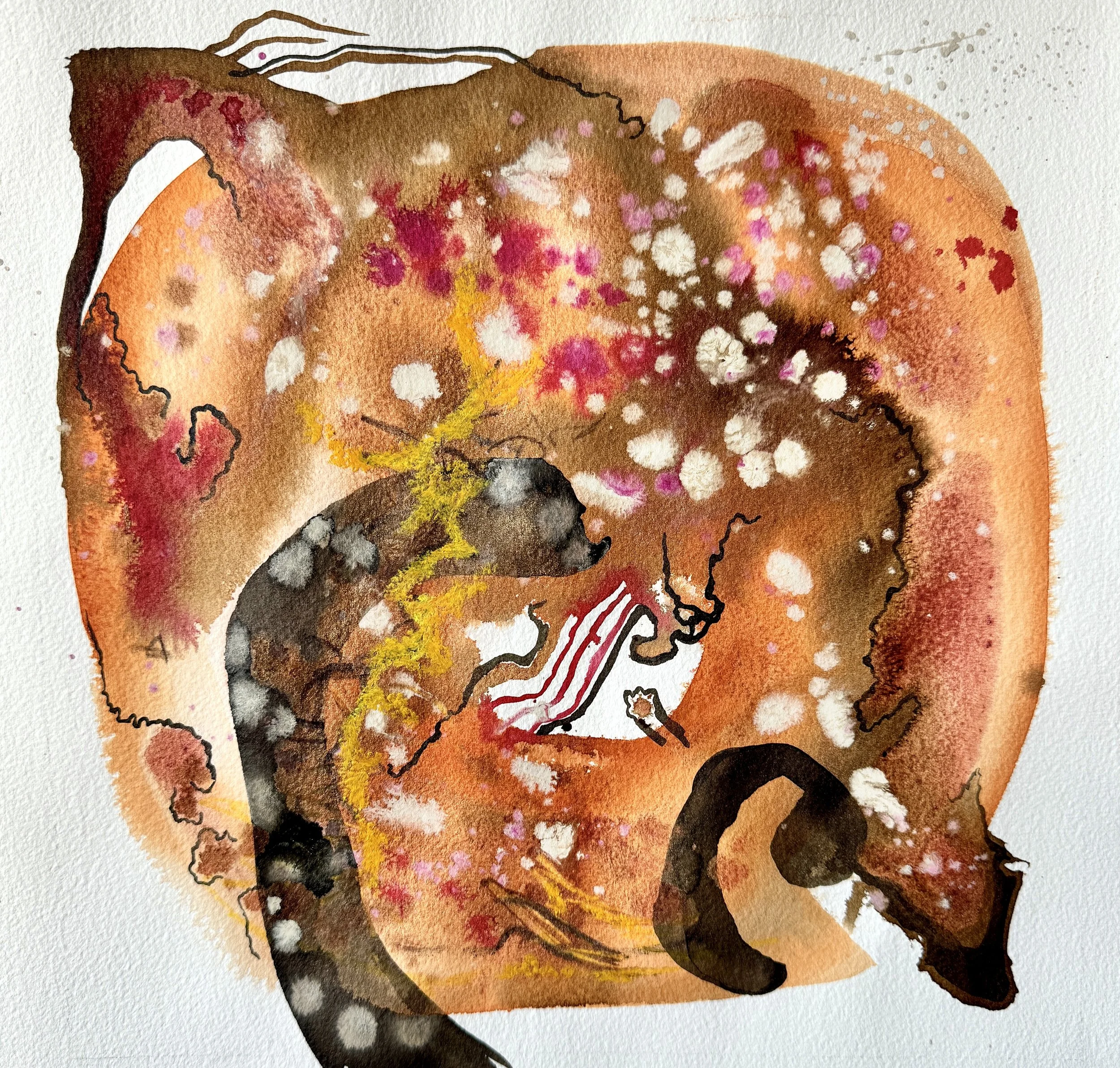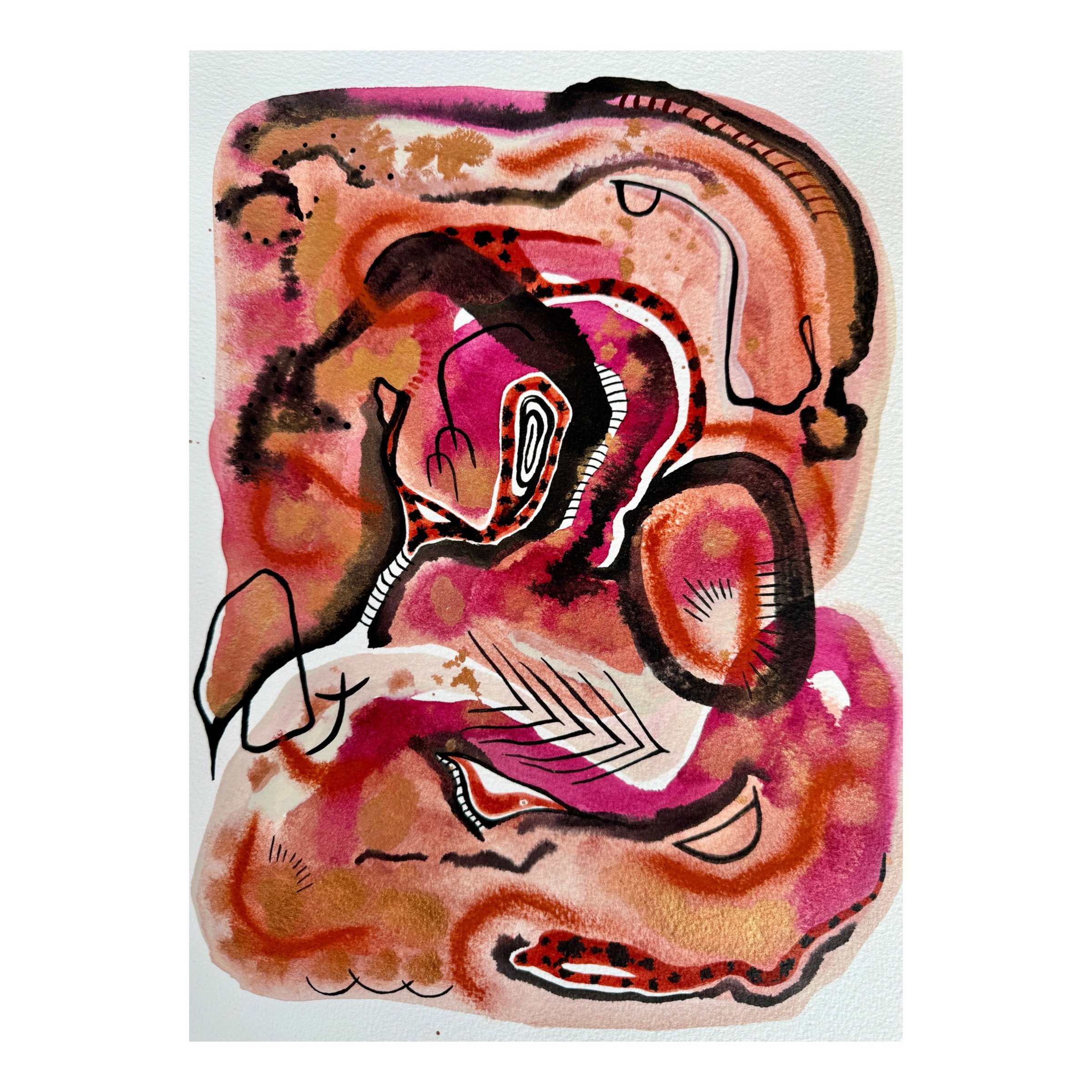 Using a vibrant palette of watercolor and acrylic paints, the artworks feature a fusion of organic forms and dynamic textures. The soft washes of watercolor evoke the earthiness of natural pigments, while bold strokes of acrylic introduce a modern vibrancy, allowing for layers of depth and emotion. The interplay between these mediums creates a tension between fluidity and structure, mimicking the balance of chaos and order found in nature. The use of dry tools pays homage to ancient methods, emphasizing the instinctual mark-making that characterized early human expression.